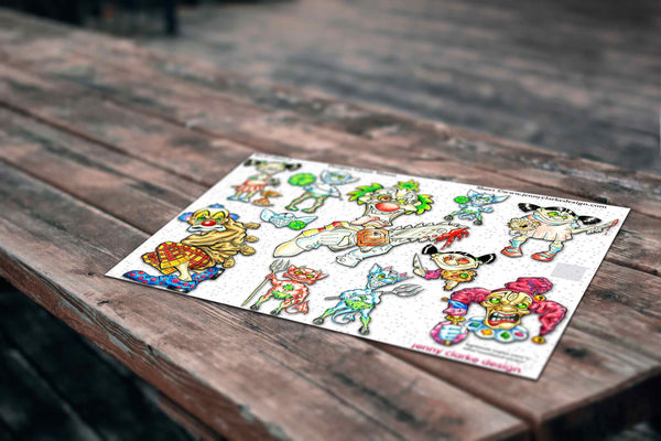 A charming set in a unique cartoon style. With Janie's signature characters, the stitched together "baggies", in a variety of silly, funny and rude attitudes. Also featuring grumpy inelegant fairies, somewhat mad cats and bright but sinister killer clowns.