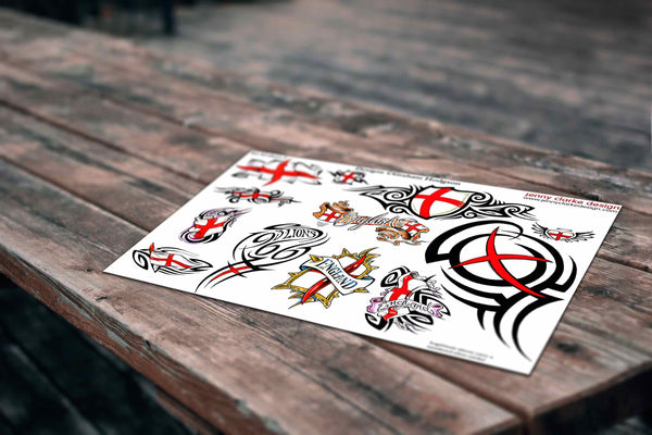 A classic set of English patriotic tattoo designs. Bright red England flags sit with beautiful grey shade George and the dragon and knight designs. With lions, banners and bulldogs with attitude, the set offers a great range of strong designs.