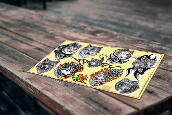 A nice variety of pencil shaded wolf portraits in a differing moods and settings. With noble, serene and cute wolves set with tribal, celtic, flowers and flames as backgrounds. A comprehensive set of medium sized wolf tattoos, also depicted in a black work tribal style.